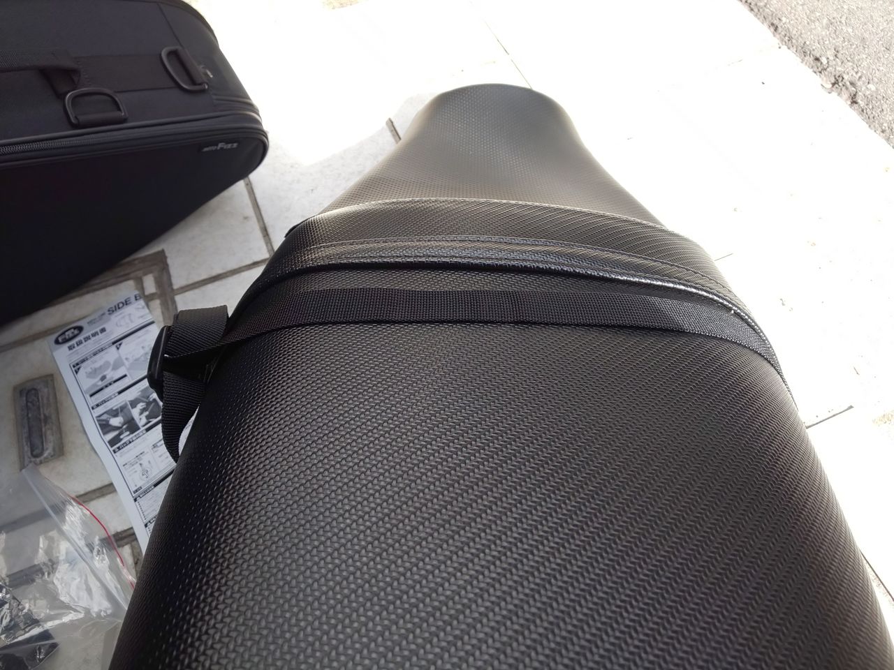 実際バックを取り付けてみてベルト位置を調整するんですが、筆者の車種ZZR1400はこんな所になると思います。調度シート下のゴム足があるすぐ後ろくらいです。