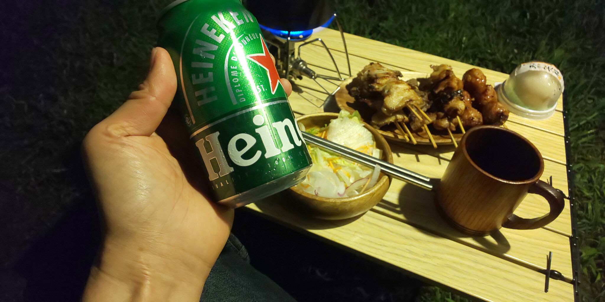 スーパーで買ってきた焼鳥を肴に、飯を炊きながら晩酌でも・・って所で、このキャンプ場のオーナー(UJack社長さん)からお声がかかって、皆で飲んで食って・・滅茶苦茶楽しかった(笑)