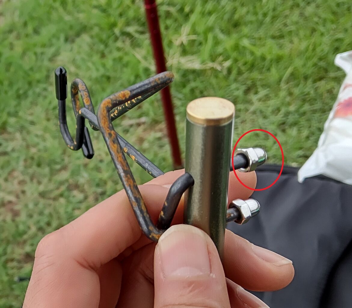 そもそも、このペグパーツ、これ単体で先にハンマーで打ち込まないといけないのに、埋め込んでしまうと本体取り付けが物凄く面倒・・・って言うかネジ込みが浅すぎて中々取りつかない。