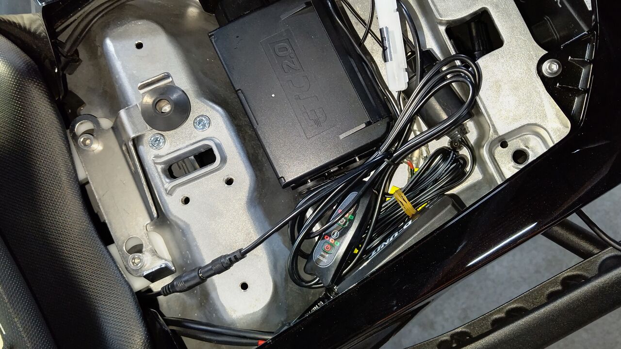 あ、電源は車両購入時、リアシート下にデイトナのターミナル電源取り付けて貰っていたので、ここからUSB電源取ってます。