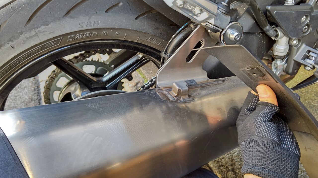 サイレンサー上の突起で引っかかってるので、車両前方方向に引っ張れば抜けます。