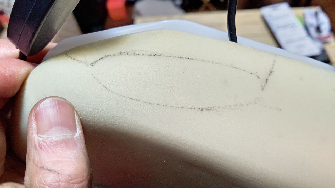 こんな風にコードを回り込ませるので、スポンジに穴を開けるかカットするか・・