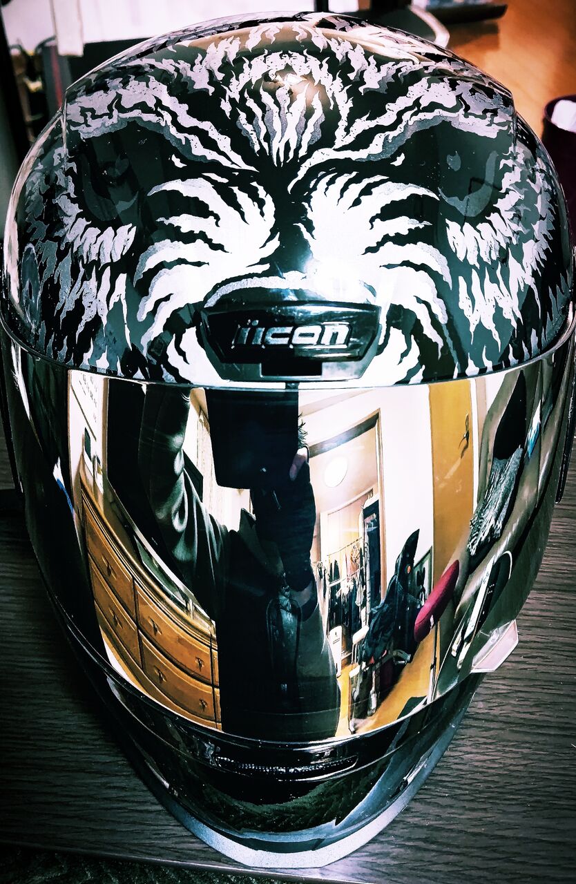 斜め上からだと普通のヘルメットに見えますね。このヘルメットのグラフィックはLYCAN=狼憑き。