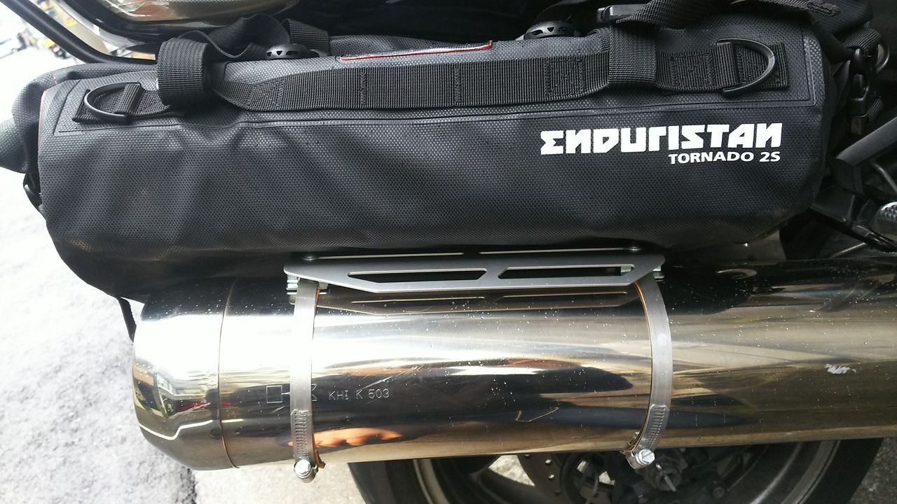 一応、この隙間に入る大きさであれば、バック径もサイレンサーの径に近く、タイヤに接触する事が無く、購入しておいた荷物ベルトを使って、トップケースのキャリアとテールカウル下のフレームに固定できた。